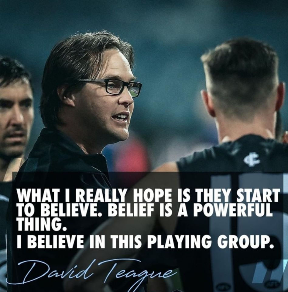 David Teague stated after the Geelong match that, ‘What I really hope is that they start to believe. Belief is a powerful thing. I believe in this playing group.’ I mean how inspiring is that message – that you as a coach, as a leader of the club, believes in the playing group and what they can achieve.